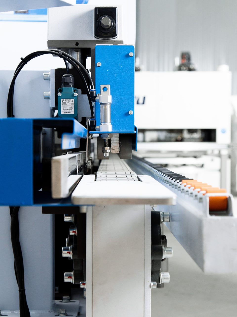 Торцовочный узел с двумя высокочастотными моторами: Оснащен высоко оборотистыми двигателями 12000 об/мин. Совершая движение по линейным направляющим, обеспечивает точное торцевание в размер пильными дисками D-100 мм.