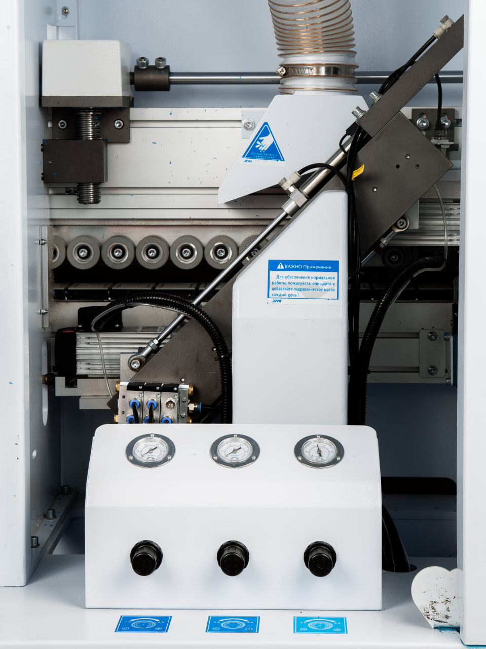 Клеевая ванна с нижним расположением, не требует перенастройки на толщину материала, обеспечивает безупречное нанесение клея расплава на торец обрабатываемой детали.