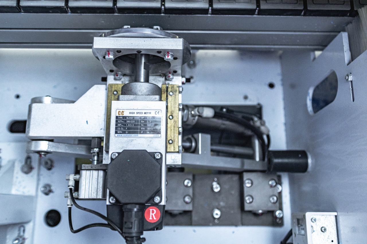 Узел закругления углов кромки (раундер) оснащен двумя высокооборотными двигателями мощностью по 0,35 кВт. Работает с деталями высотой от 10 до 60 мм. Минимальная длина заготовки 250 мм (при высоте детали 18мм)
