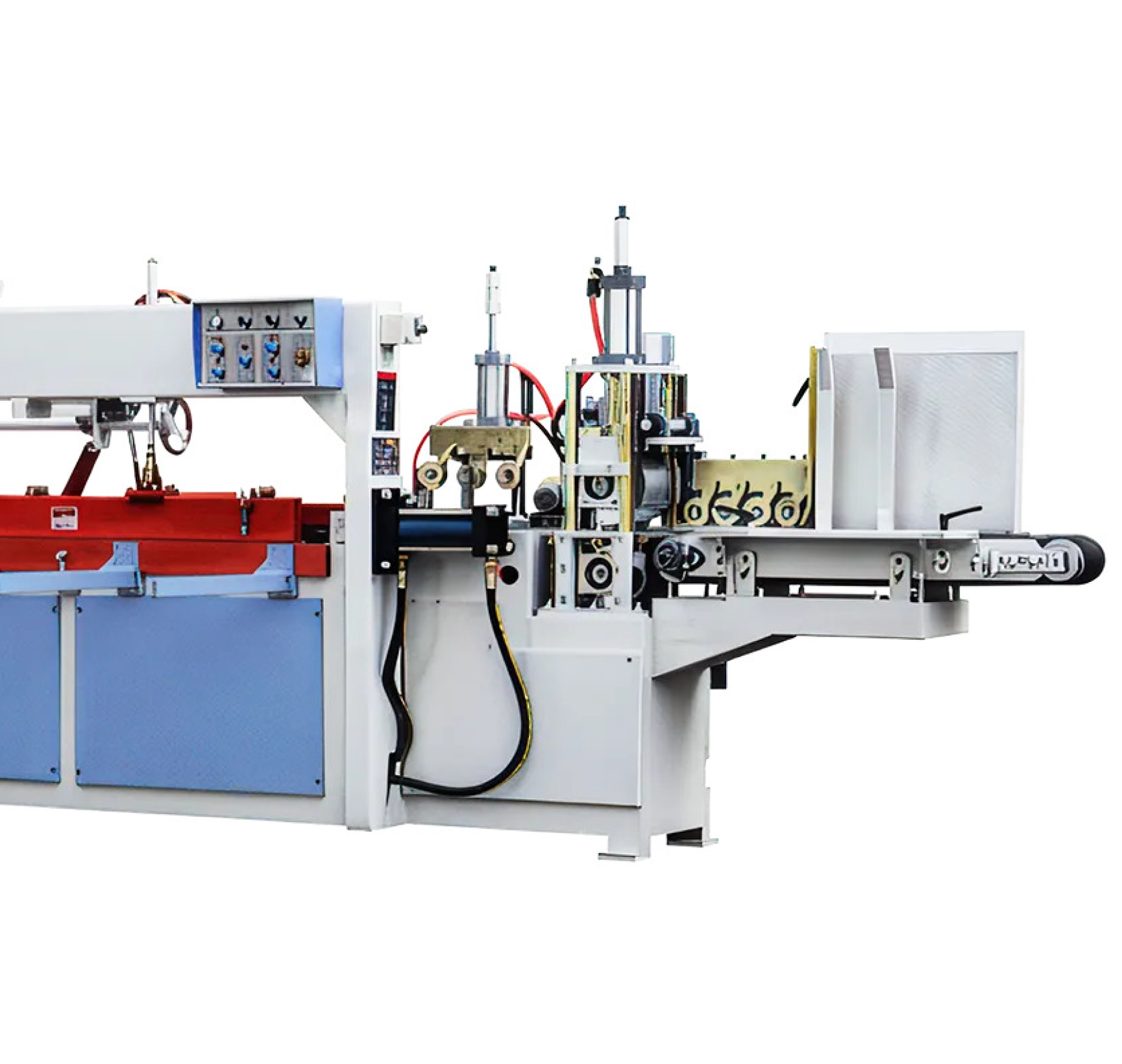 Торцовочная пила установлена на шпинделе с высокоточными подшипниками и приводом от электродвигателя через клиноременную передачу. Подача пилы для отрезки набранной плети в размер осуществляется пневмоцилиндром с регулировкой скорости перемещения. Обеспечивается плавный подъем и ускоренный возврат узла в исходное положение, что сокращает время цикла на данной операции.