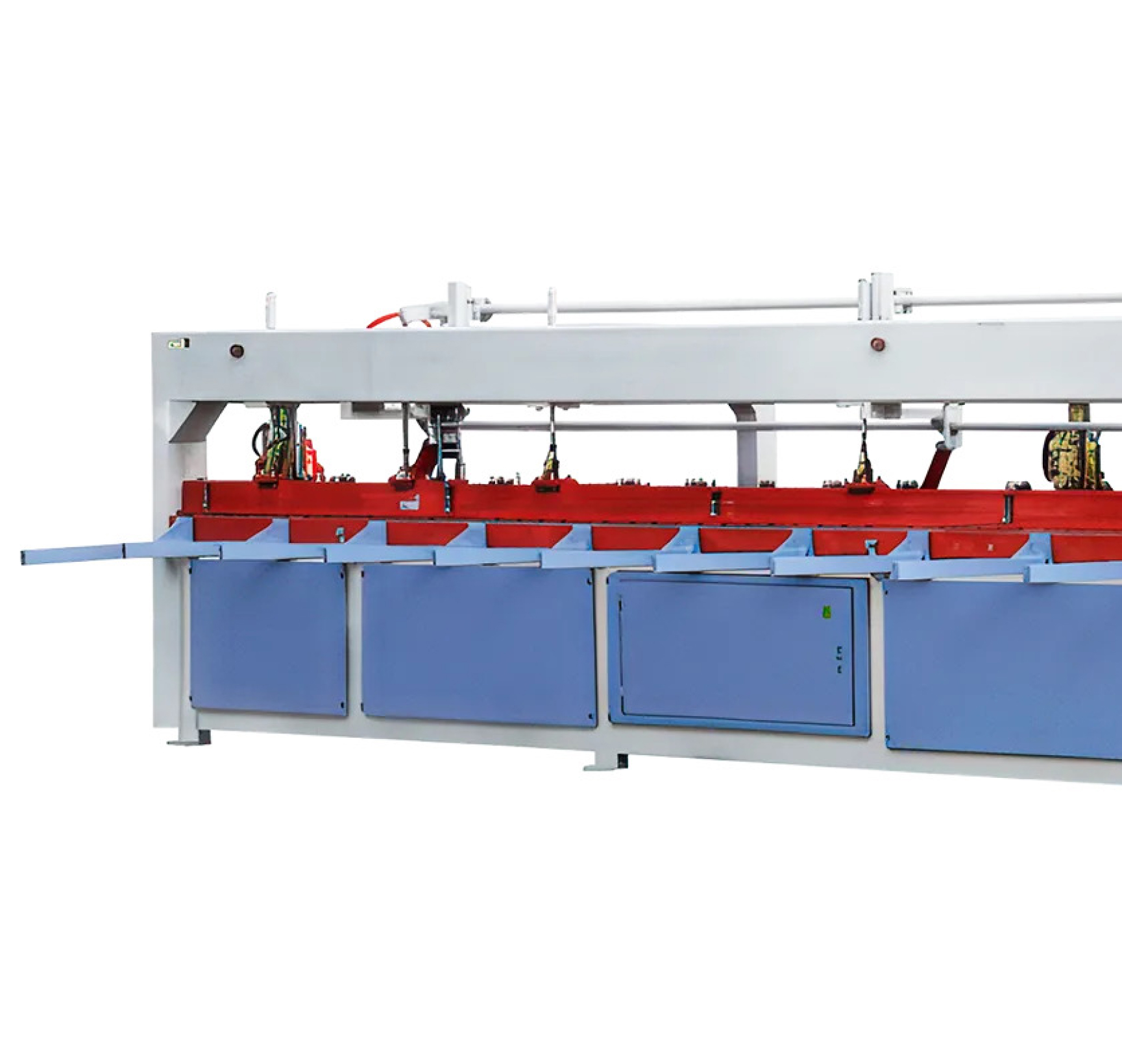 Прижим, перемещенной в зону прессования плети, осуществляется боковой линейкой с помощью пневмоцилиндров по всей плоскости заготовки к выдвижному упору. Обеспечивается надежное базирование плети.