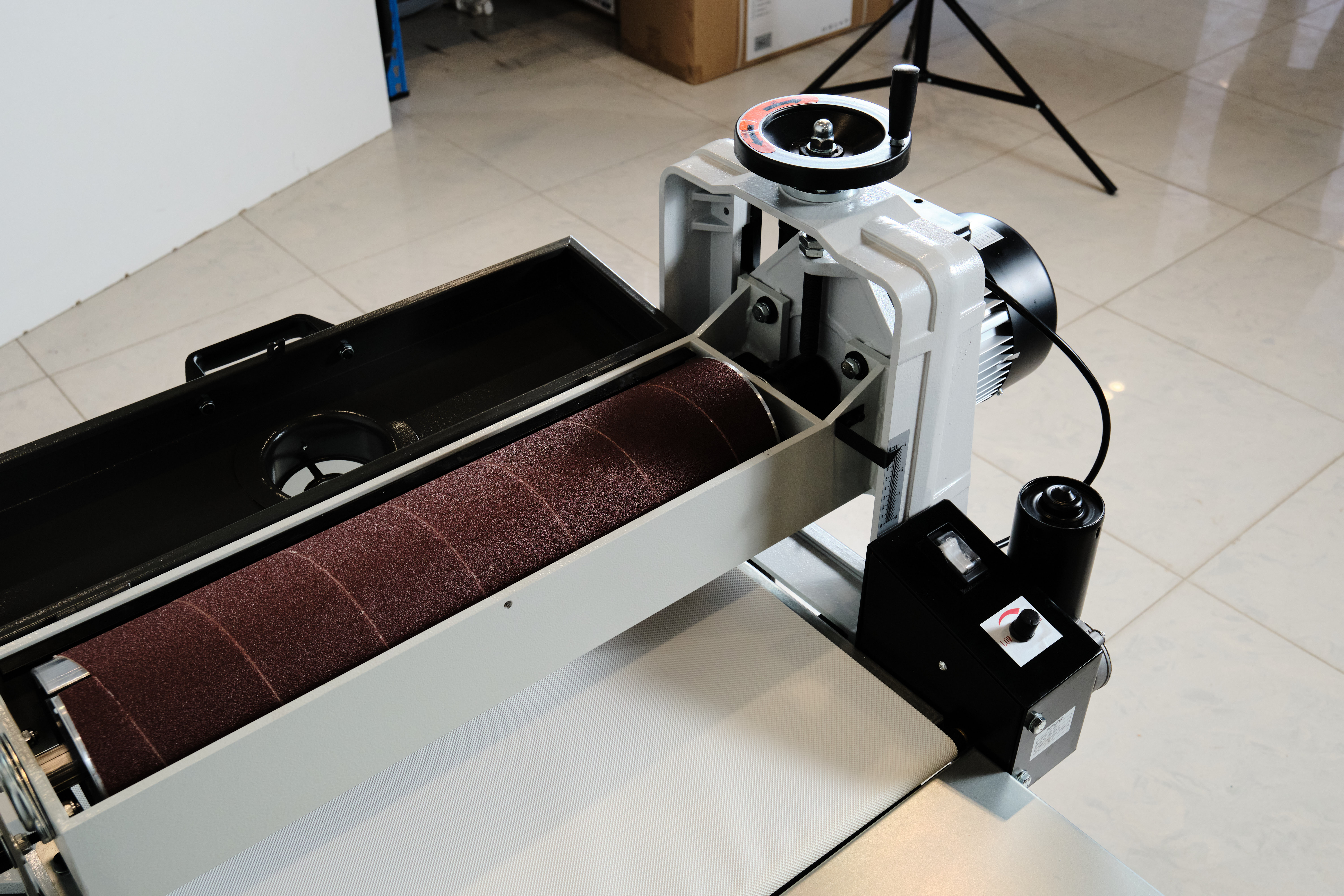 Шлифовальный барабан имеет консольное расположение. При необходимости обработки более широких заготовок можно снять левую стойку и в два прохода обрабатывать детали шириной до 1110 мм.