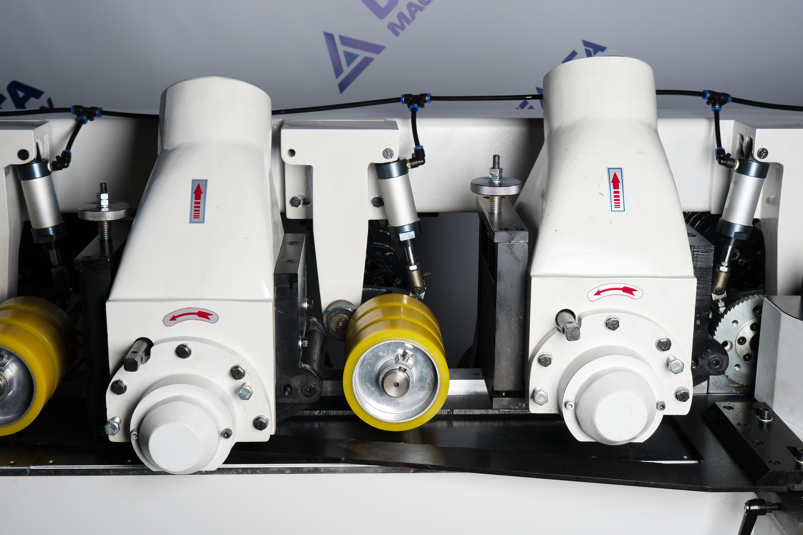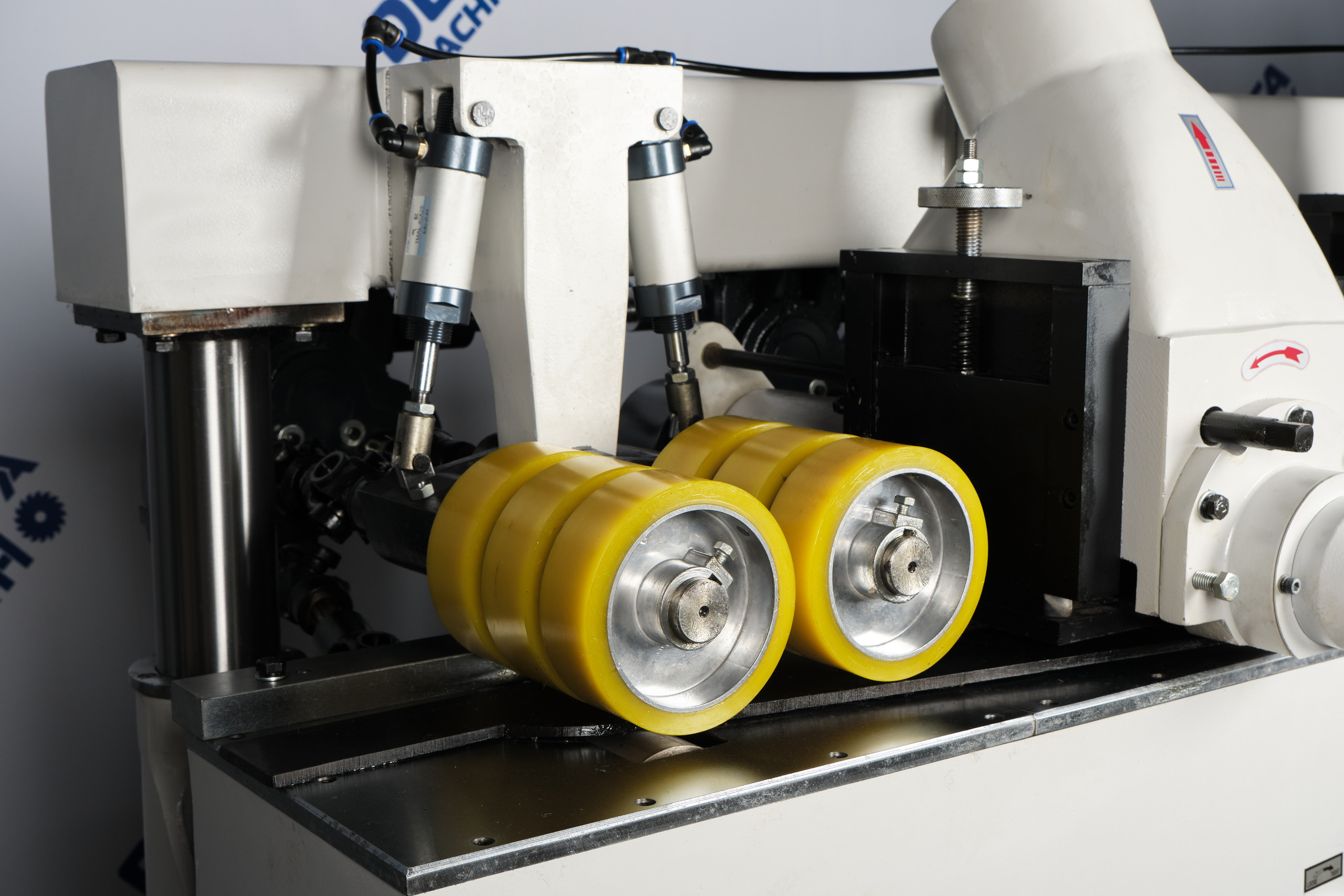 Пневматическое подающий ролик имеет возможность регулировать усилие, что способствует плавной подаче заготовок, различной толщины