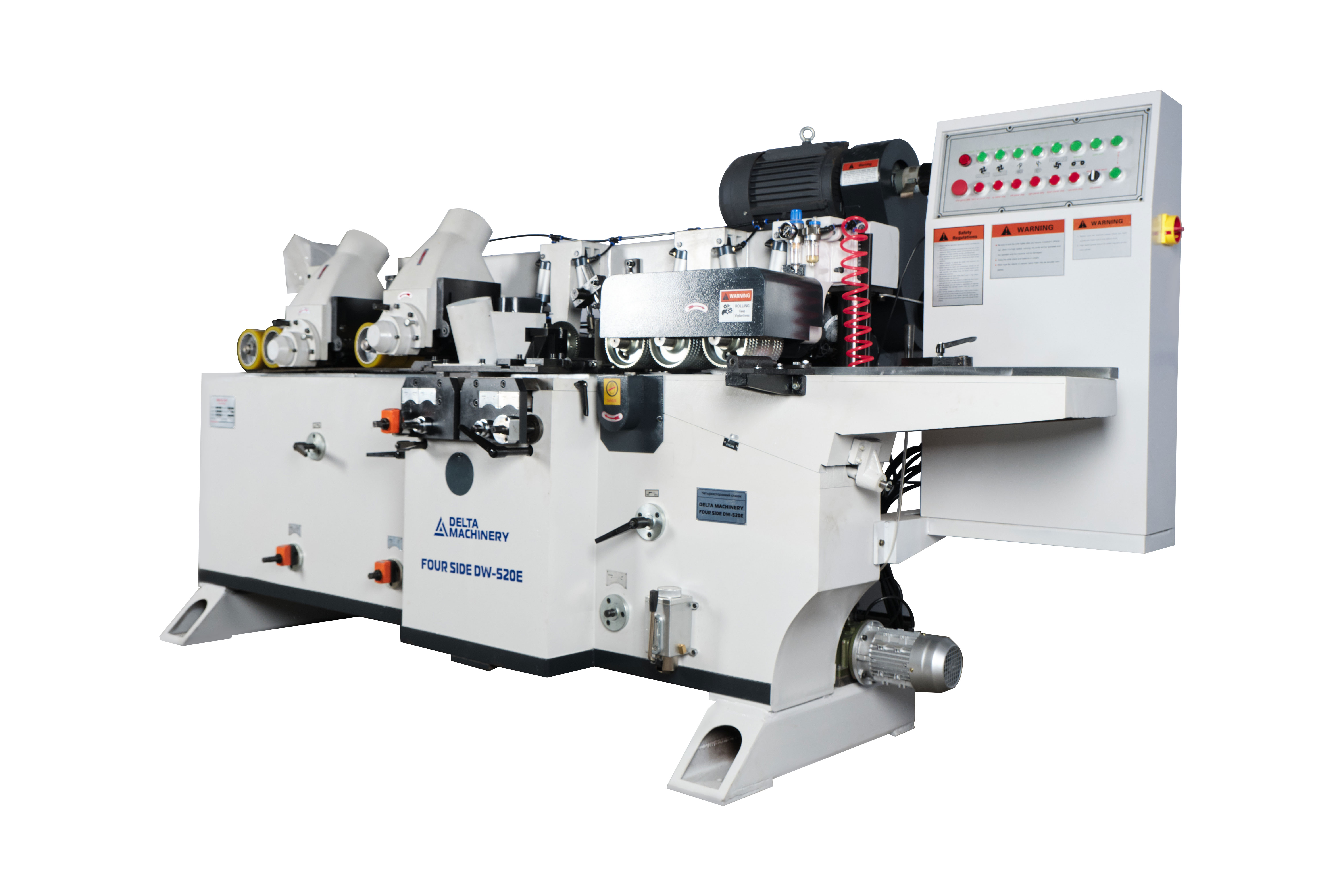Четырёхсторонний станок DELTAMACHINERY FOUR SIDE DW-520H (5 шпинделей) предназначен для высокоточной четырехсторонней обработки деревянной заготовки с целью получения высококачественных изделий за один проход. После обработки на 4-х сторонних станках отпадает необходимость в последующем шлифовании профилированных и строганных поверхностей.