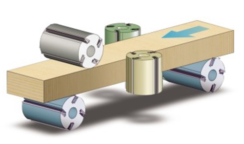 Механизм подачи состоит из верхних и нижних стальных роликов. Рифленые ролики на входе и обрезиненные на выходе, приводятся в движение системой карданных приводов и редукторов. Рифленые ролики обеспечивают стабильную подачу, а обрезиненные ролики на выходе не оставят никаких следов даже на самых мягких породах древесины.