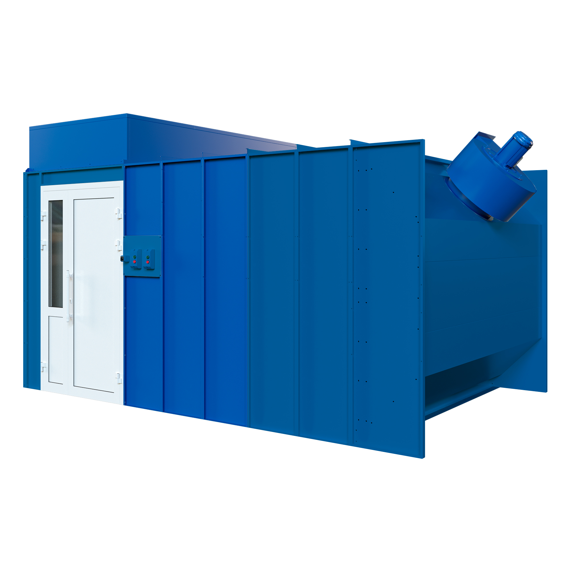 За первичную очистку, как и в чистой комнате с водяной завесой, отвечает фильтр грубой очистки воздуха, поступающего в потолочный приточный пленум. Он пропускает воздушный поток, удерживая крупные фракции посторонних примесей. Вторичную очистку выполняет сам приточный пленум, а финальная очистка ложится на зону сухой фильтрации, которая обеспечивает вытяжку излишков окрасочного тумана, возникающих во время распыления лакокрасочных веществ. В крышу вмонтирован вентилятор, который формирует разреженную атмосферу и заставляет частицы пыли и химических веществ поступать на фильтры.