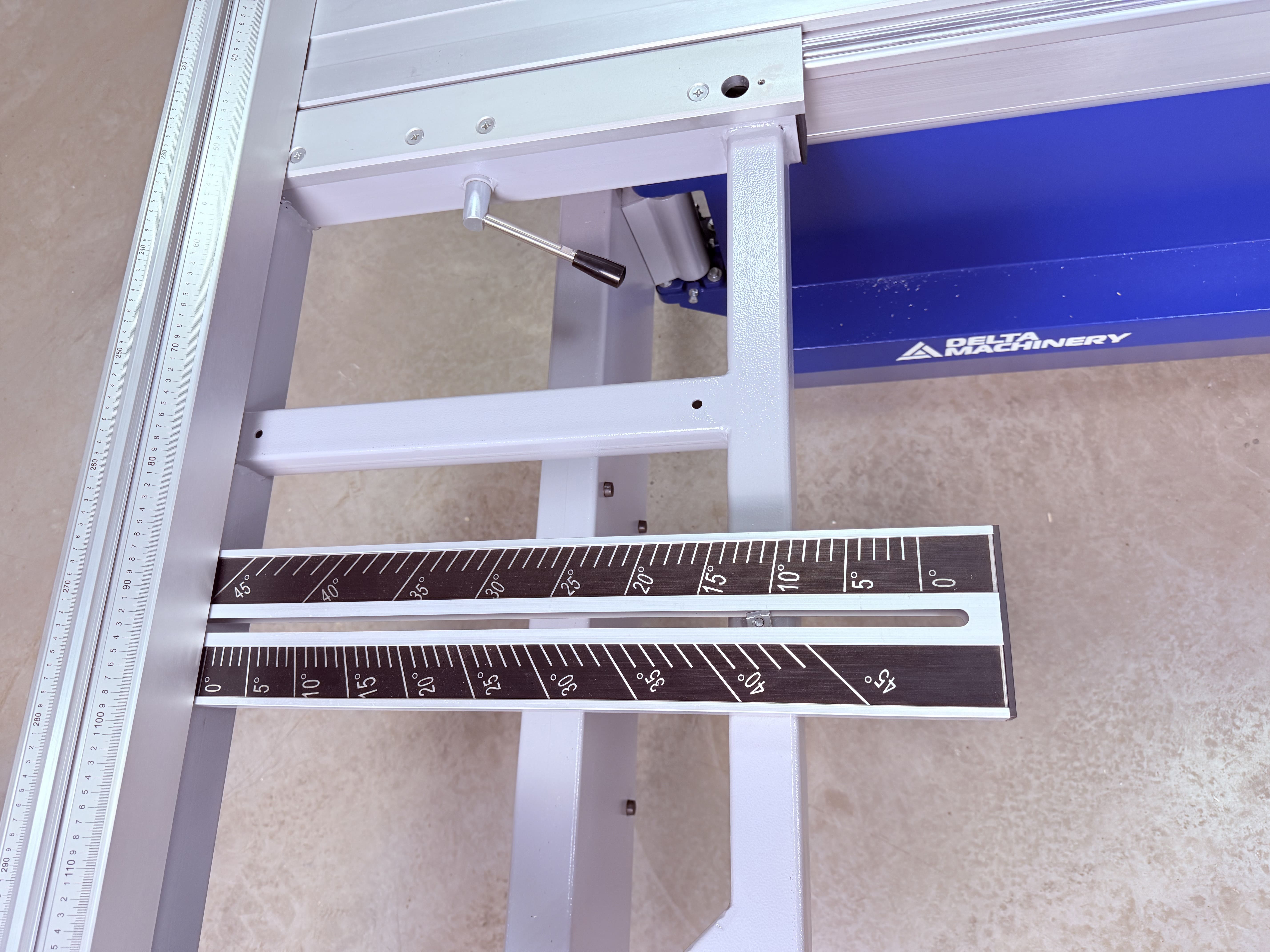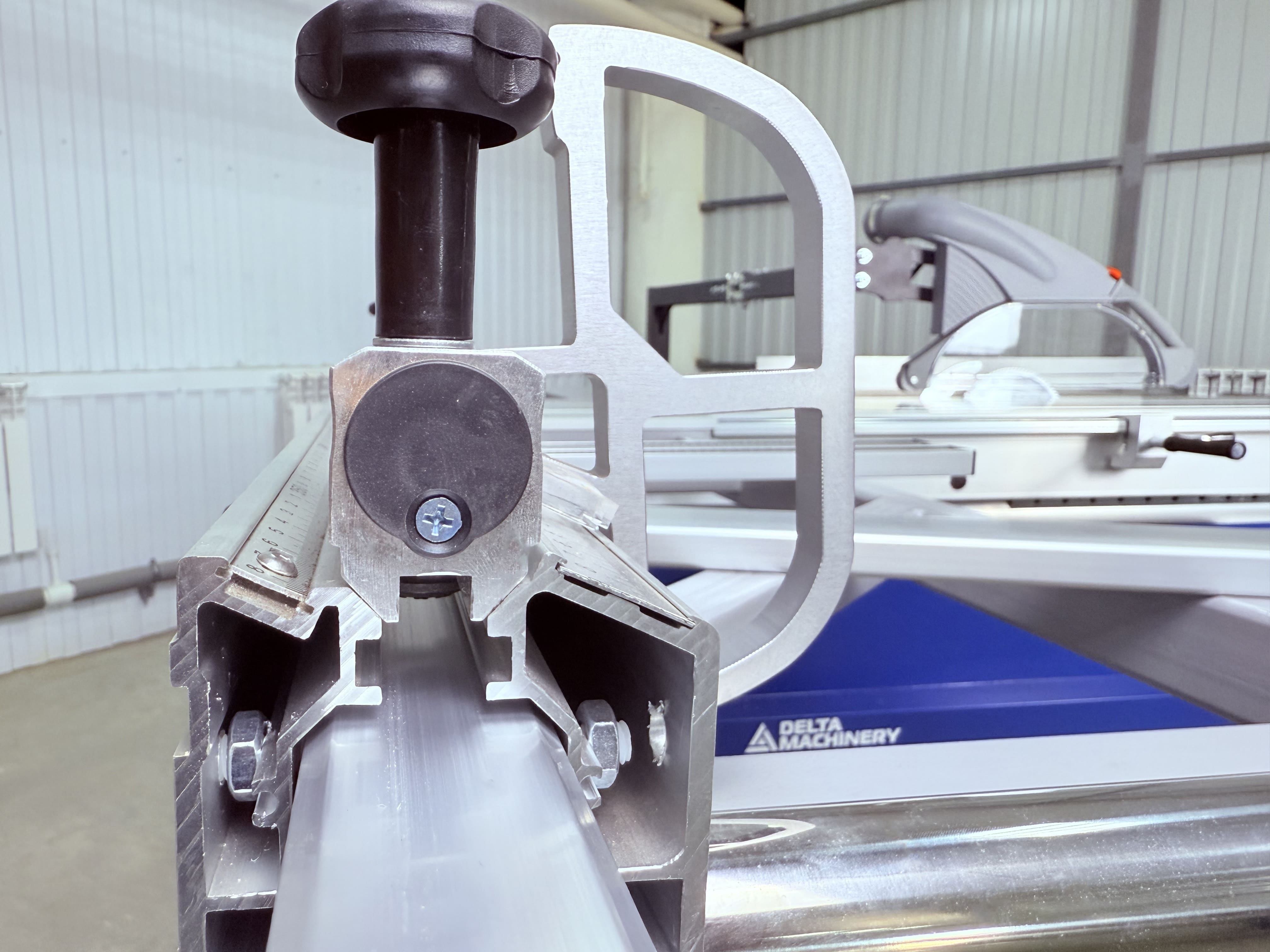 Поперечная линейка станка жестко фиксируется к поддерживающему столу в двух точках под углом 90 градусов к линии пропила. Настраивается единожды и не требует дополнительных регулировок. Это исключает смещение линейки во время работы и гарантирует правильную геометрию раскроя.