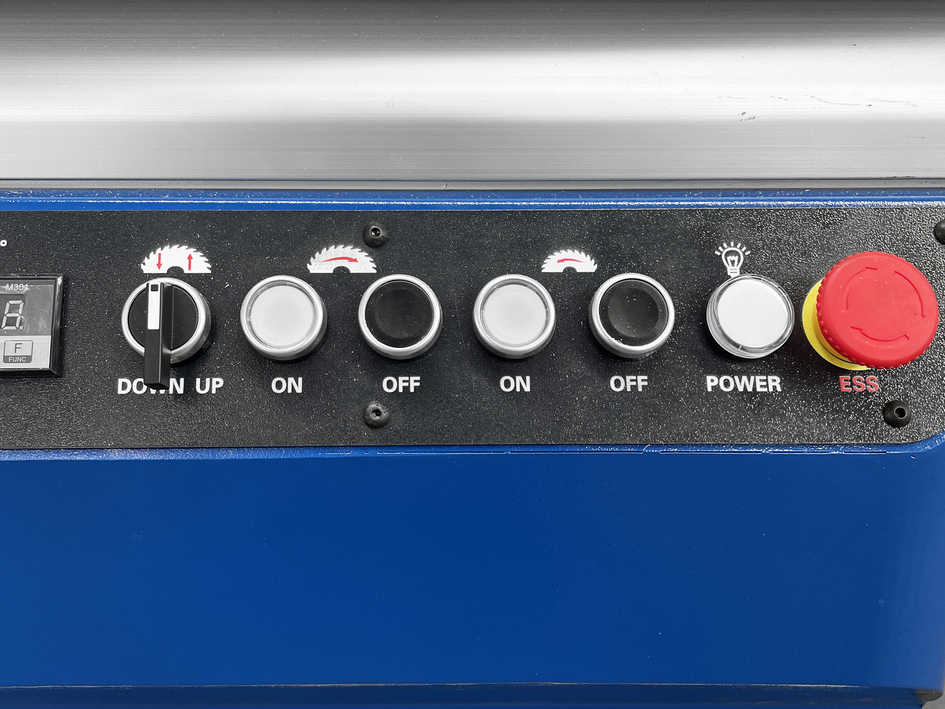 Эргономичный пульт управления оснащен цифровой индикацией угла наклона пильного узла Кнопками «пуск» / «стоп» основной и подрезной пилы, кнопкой «аварийный стоп» и лампой-индикатором работы станка. Маховик угла наклона пильного узла находится на лицевой части станка. Маховик подьема-опускания находится сбоку.