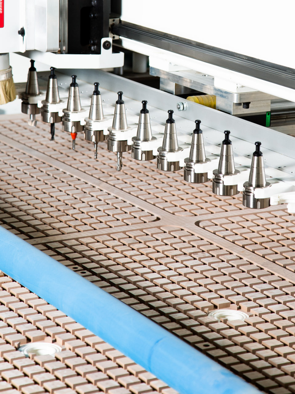 Для удобства загрузки обрабатываемых листов материала на стол предусмотрены специальные ролики. Кроме того, станок в базовом исполнении оснащен системой разгрузки, которая сталкивает обработанные детали и очищает стол от стружки. Всё это в целом ускоряет процесс производства.