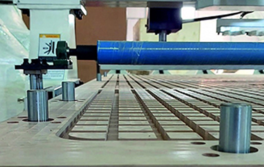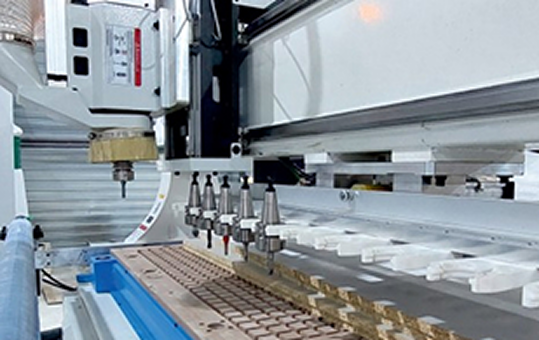 Сверлильная группа на 9 независимых инструментов по оси X и Y позволяет производить плоскостную присадку с высокой точностью и скоростью.