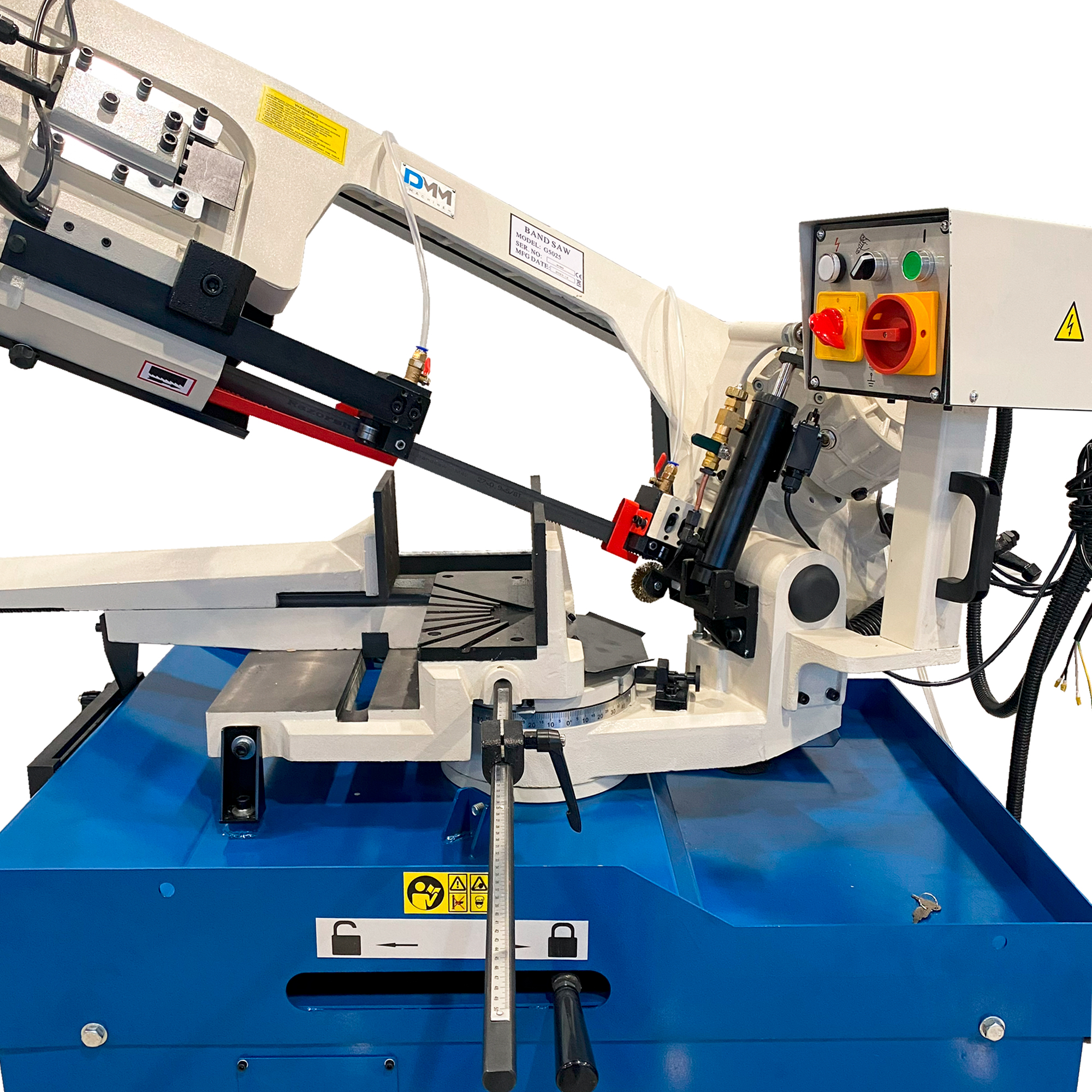 Конструкция станка DMM MWS-250 представляет собой надежное и массивное основание (станина), на котором установлена прочная пильная рама из чугуна с редукторным приводом и ленточнопильным полотном. Тяжелый пильный модуль, надежно закреплённый на станине, позволяет выполнять резку заготовок большого сечения с сохранением точности.