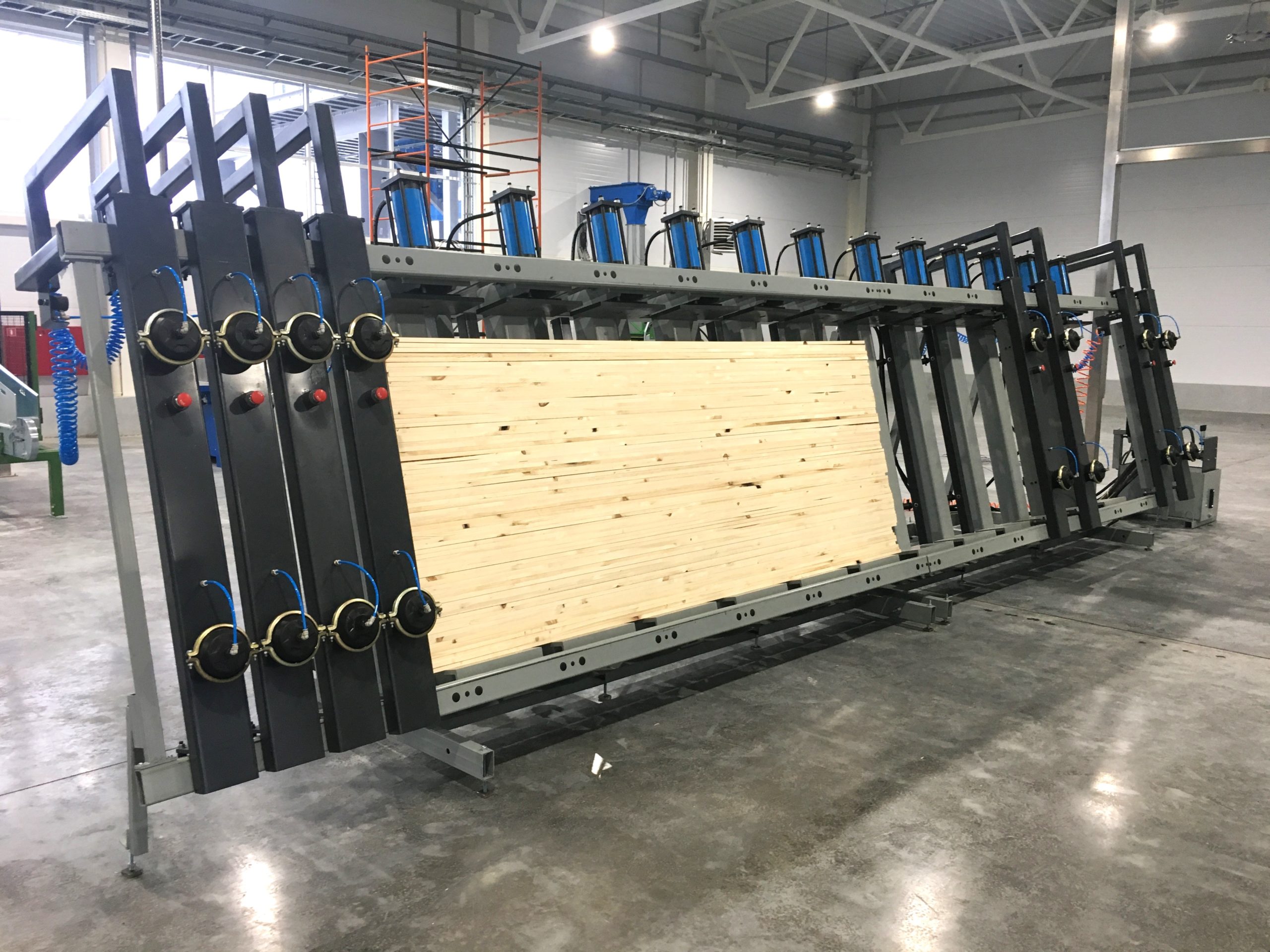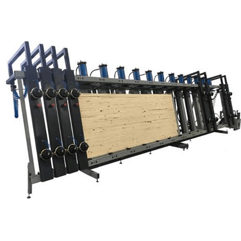 Вайма гидравлическая оснащена откатными пневматическими фронтальными прижимами. Их перемещение за пределы рабочей зоны обеспечивает свободный доступ при укладке и выгрузке. Откатные пневматические фронтальные прижимы гарантированно выравнивают и удерживают пакет заготовок во время прессования.
