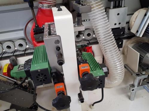 Узел оснащен электропневматическим управлением в горизонтальной плоскости, двумя моторами 2 x 2,2 кВт, 12 000 об/мин (первый мотор работает в направлении подачи, второй против - для избежание сколов), максимальный припуск на обработку 3 мм.