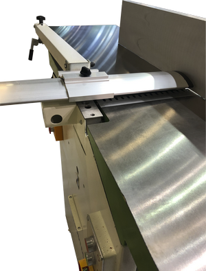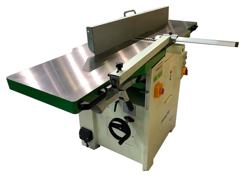 Снабжен профессиональной упорной линейкой (которая крепится к торцу подающего стола) и дает возможность устанавливать станок возле стены, тем самым не теряя площадь в цеху. Защита фуговального вала, обеспечивает безопасность в работе оператора.