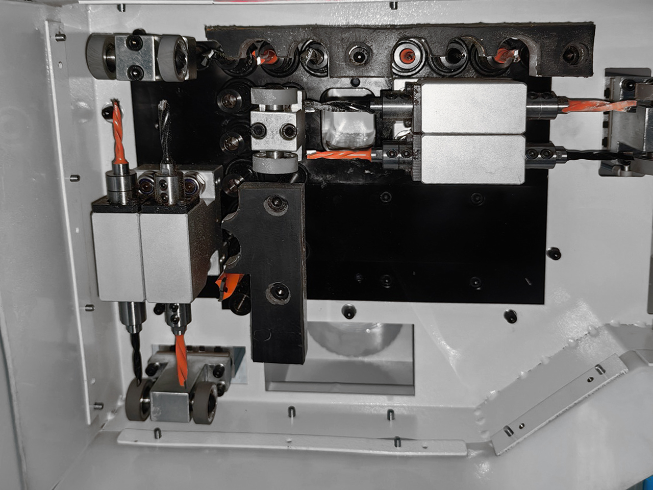 Две сверлильных группы: одна верх-няя и одна нижняя + 2 фрезерных узла (один сверху и один снизу).
