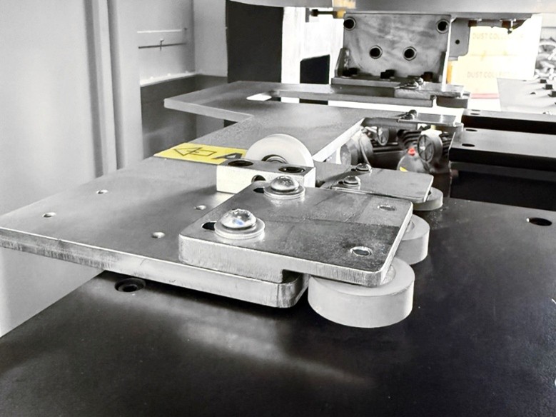 Программно-управляемый боковой упор с обрезиненными роликами для надежного и точного позиционирования детали.