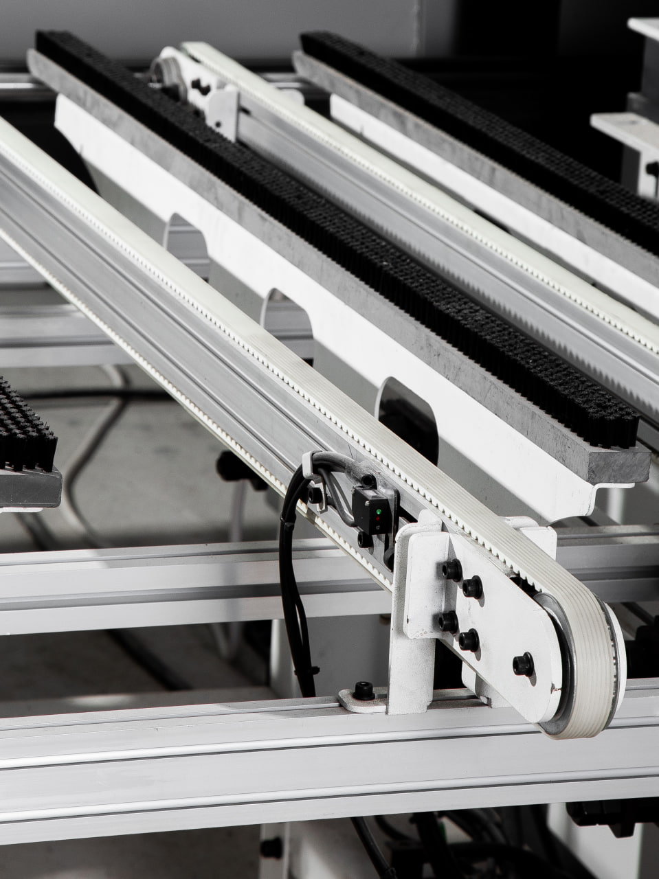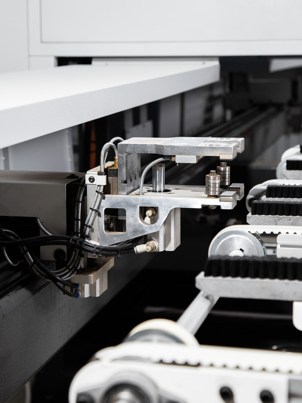 Программно-управляемый боковой упор с обрезиненными роликами, для надежного и точного позиционирования детали.