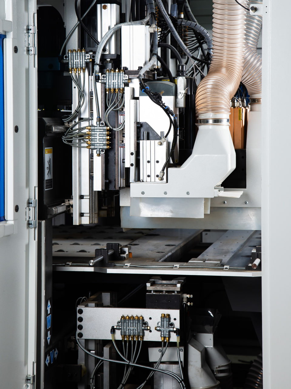 Выполнение любых карт присадки с шести сторон за один проход детали, фрезерование прямых и криволинейных пазов с помощью верхнего и нижнего фрезерных агрегатов.