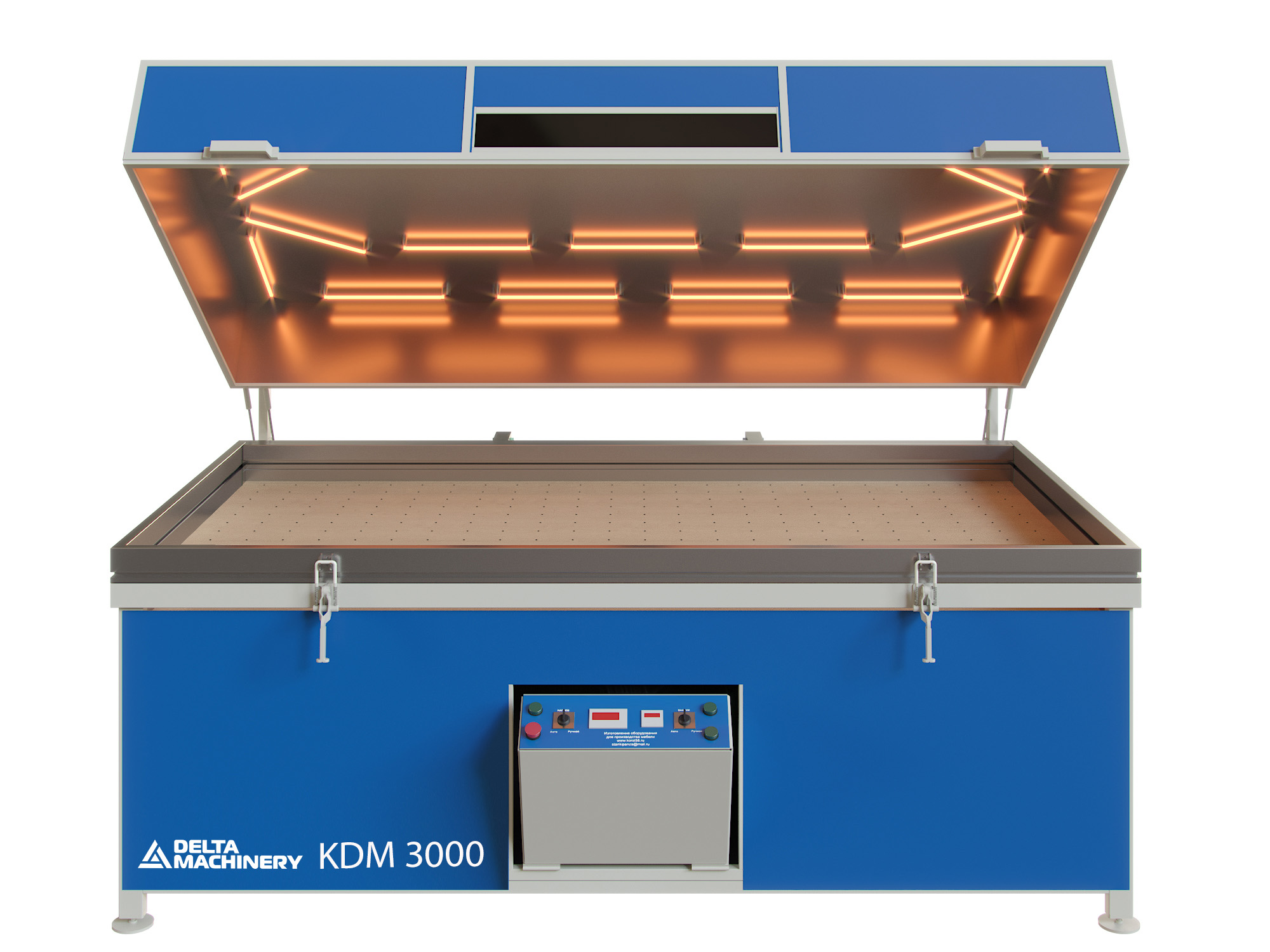 Вакуумный пресс для мебели KDM 3200 – это удобное и эффективное оборудование, специально созданное для облицовки мебельных фасадов (МДФ, ДСП и т.п.) ПВХ плёнками, шпоном, пластиком, текстурированной бумагой.