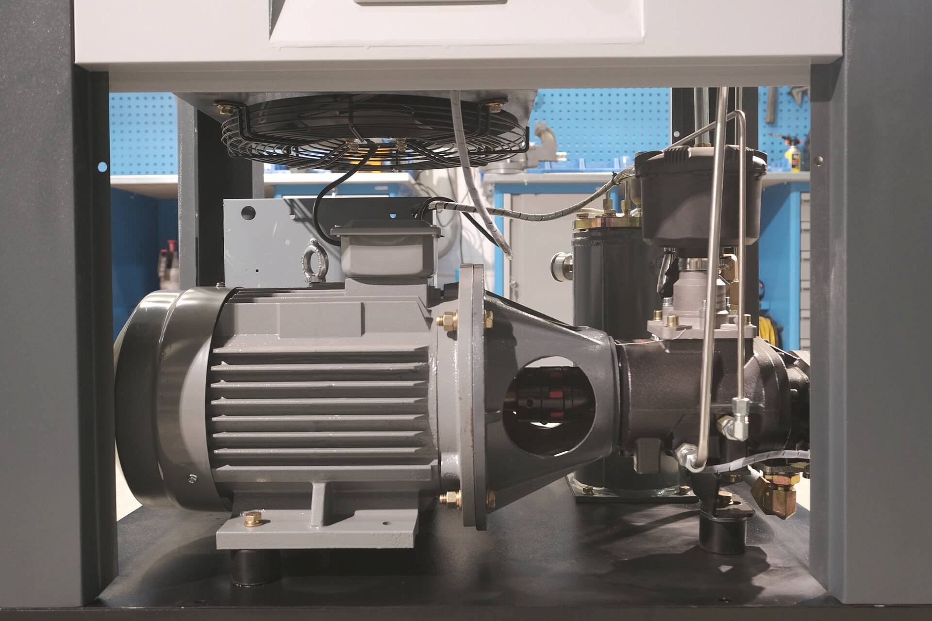 Высокий показатель передачи КПД реализуется с помощью эластичной муфты, способной так же гасить все вибрационные нагрузки во время пуска и работы компрессора. Благодаря конструкции, в которой валы винтового блока и электродвигателя находятся на одной оси – винтовые компрессоры с таким принципом передачи КПД имеют индекс “повышенной мощности” и отличаются высокими показателями надёжности.