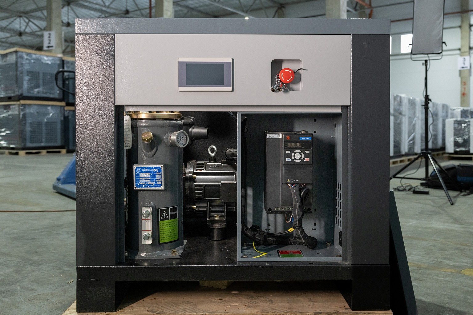 Частотный преобразователь Folinn обеспечивает плавный запуск и остановку компрессора, снижает пусковые токи двигателя и защищает устройство от перегрузок, короткого замыкания или потери фазы.