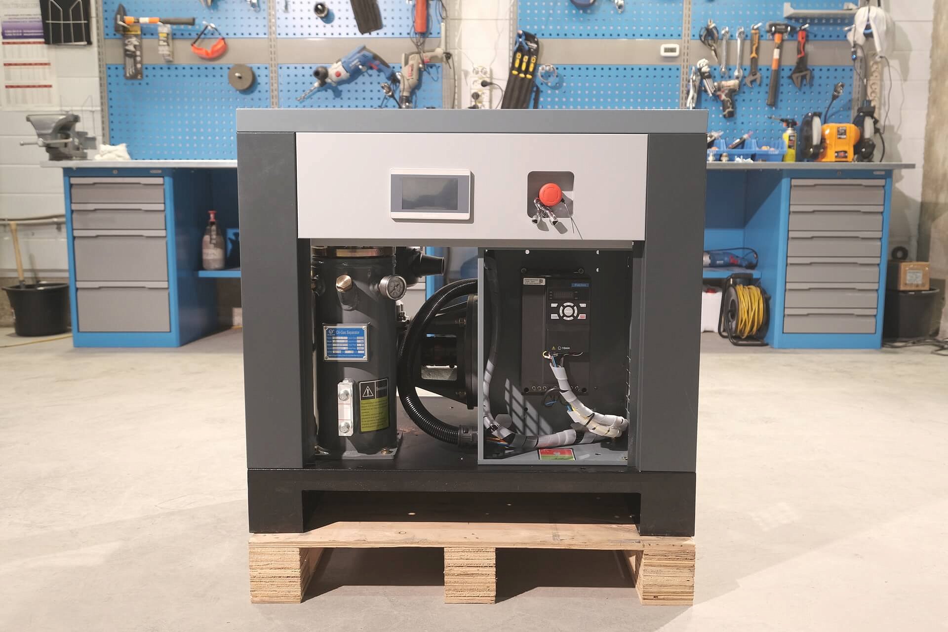 Обеспечивает плавный пуск и остановку компрессора. Так же плавный пуск позволяет снизить пусковые токи двигателя, что помогает не перегружать линию электроснабжения. Так же преобразователь частоты обеспечивают защита компрессора от различных аварийных ситуаций, таких как перегрузка, короткое замыкание, потеря фазы и другие.